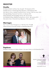 REGISTER Deaths Mr Robert McNeill, 36 Killane Park, Ahoghill, 19th November 2014 Mrs Mae Morrison, 40 Devenagh Way, Ballymena, 13th December 2014 Mrs Catherine Nevin, Seabank Residential Home, Portrush, 18th December 2014 Mrs Agnes Dickey, Pinewood Care Home, 1st January 2015 Mrs Lynda McKay, 24 Grangeleigh Avenue, 5th January 2015 Mrs Sadie McCartney, Braefeld Nursing Home, Connor, 14th January 2015 Miss Letitia Grant, 8 Granville Drive, Ballymena, 19th January 2015 Marriages Ryan Lavery to Claire Montgomery on 15th November 2014 [1] Graham Murray to Tania McCullough on 22nd December 2014 1 Baptisms Daughter of Andrew and Kathryn Dickson, Lily Logan Dickson on 21st December 2014 High Kirk Presbyterian Church 65-71 Thomas Street Ballymena Tel: 028 2564 4834 fax: 028 2564 4834 www.highkirk.org.uk