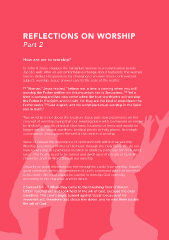 REFLECTIONS ON WORSHIP Part 2 How are we to worship? In John 4 Jesus engages the Samaritan woman in a conversation beside Jacob’s well. After an uncomfortable exchange about husbands, the woman tries to defect His questions by changing to an even more controversial subject, worship. Jesus’ answer cuts to the core of the matter. 21 “Woman,” Jesus replied, “believe me, a time is coming when you will 23 worship the Father neither on this mountain nor in Jerusalem… Yet a time is coming and has now come when the true worshipers will worship the Father in the Spirit and in truth, for they are the kind of worshipers the Father seeks. 24 God is spirit, and his worshipers must worship in the Spirit and in truth.” True worship is not about the location. Jesus puts new parameters on her concept of worship saying that our meeting place with God would no longer be limited to specifc physical structures, locations or times and would no longer involve animal sacrifces, Levitical priests or holy places. In a single conversation Jesus places Himself at the centre of worship. Verse 24 reveals the importance of spirit and truth within true worship. Worship becomes a matter of the heart through the Holy Spirit. We do not have to worship in a particular location or abide by particular set of ritualistic rules. Our hearts need to be turned and dwell upon the truth of God, His character, and His Word though our worship. Sincerity or good intentions are not enough to create true worship. Uzzah’s good intentions led to disobedience of God’s command which in turn lead to his death. We must always be careful to worship God correctly, according to His character and His Word. 2 Samuel 6:6 - 7 When they came to the threshing foor of Nakon, Uzzah reached out and took hold of the ark of God, because the oxen stumbled. The Lord’s anger burned against Uzzah because of his irreverent act; therefore God struck him down, and he died there beside the ark of God.