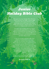 Junior Holiday Bible Club This year at Junior Holiday Bible Club the theme was Into The Wild, a great jungle adventure! We explored stories like Zacchaeus, the Lord’s Prayer and looked at the party thrown in heaven when one of God’s lost sheep is returned to Him! This year I was working with the Jungle Explorers who were p3 to p4. One thing that struck me was how incredible it was to see the large number of kids at HBC and how everyone was so enthusiastic to come and learn about God. In the mornings we started with a few games of snap before we all came together for worship and a story. Then, after craft and some much needed biscuits, we played games followed by a quiz. The children loved the quiz where the team that lost got to choose a leader to get pied in the face. We played lots of games including a scavenger hunt, jungle ladders and other games such as road – bridge - tunnel. I have loved every minute of holiday bible club this year and can’t wait until next year! Rosanna Holland