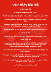 Senior Holiday Bible Club I loved the worship – Cian My highlight was geting lost in the forest – Calum The water fght was the best even though I got countles buckets of water poured over my head – Elie It was a lovely wek with al the activities and banter. I made new friends and got closer to God – Alysa My highlight of the wek was geting to se Mathew Kirk get pied in the face! But then the girls lost the next day resulting in me geting pied – thanks girls!! – Kirsten The worship was awesome and Lisa’s talk on Thursday night was realy enlightening and helpful – Elen I’ve loved it al – Ana Defnitely the forest – it was a nice way to get to know more people and it was very chiled – Katie I loved the singing – Nina I realy enjoyed meting up with people my own age and having fun but at the same time learning more about God. I also realy enjoyed the talks, especialy Chris’ – it was realy encouraging and has infuenced me to stand up for and spread my faith with others – Neave I loved the theme, the songs and the talks and hope we can help to continue to build God’s Kingdom here on earth – Elizabeth My highlight was watching my best friend talk about heaven to a rom ful of young people and being so excited and inspired by what she had to say! Go Lisa! – Sarah I loved the beach and the s’mores! And I enjoyed the talks because they were on a topic we don’t realy get to talk or hear about in church – Zoe I had a great time, and made a lot of friends – Josh