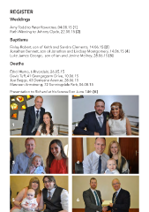 REGISTER Weddings Amy Todd to Peter Rowntree, 04.08.15 [1] Ruth Winning to Johnny Clyde, 22.08.15 [2] Baptisms Finlay Robert, son of Keith and Sandra Clements, 14.06.15 [3] Jonathan Bennett, son of Jonathan and Lindsay Montgomery, 14.06.15 [4] Luke James George, son of Ian and Jenine McIlroy, 28.06.15 [5] Deaths Ethel Hume, 6 Riverdale, 26.05.15 Davis Tuff, 41 Grangegorm Drive, 10.06.15 Joe Beggs, 43 Demesne Avenue, 28.06.15 Maureen Armstrong, 72 Sunningdale Park, 04.08.15 Presentation to Richard at his farewell on June 14th [6] 1 2 3 4 5 6