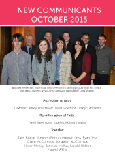 NEW COMMUNICANTS OCTOBER 2015 Bible Academy Reason I go to Bible Academy; fellowship, discussion, thought provoking and cofee!! Diane Hayes I have been going to the Bible Academy for quite a few years. I really enjoy learning about the Bible in greater depth, discussing issues and being able to ask questions. We also learn from each other and can share how God’s word has helped us to cope with life in the good and bad times. Norma Harpur Back row: Fred Moore, David Shaw, David Stevenson, Richard Topping, Jonathan McCormick Front Row: David McCartney, Jenny Sutherland, Naomi White, Lorna Topping The Bible Academy is made up of a fairly small group of individuals who are currently looking at the book of Psalms in a relaxed and informal setting. We enjoy learning from Profession of faith: each other without any pressure to contribute if we do not want to. It is not only an enjoyable way to spend a morning with new friends but it is of great spiritual beneft too, as we open our minds and hearts to the leading of the Holy Spirit. Cofee and David McCartney, Fred Moore, David Stevenson, Jenny Sutherland scones are greatly appreciated and provide the opportunity to get to know the others who come along too. Re-Afrmation of Faith: Brian and Laurene Patterson David Shaw, Lorna Topping, Richard Topping Bible Academy is a highlight of my week as we study God’s word in more depth. It is a Transfer: great forum for discussion and discovery together, of the truths on God’s word. Recently we have completed an overview of the Bible, looked at the Psalms, Galatians, Covenant, Tabernacle and Temple. These topics have been challenging and Julie Bishop, Stephen Bishop, Hannah Jess, Ryan Jess have helped to develop my devotional life. Plus I like the chat, scones and cofee. Claire McCormick, Jonathan McCormick Stephen Orr Helen McKay, Jamesie McKay, Kendal Walker Naomi White