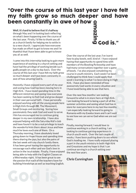 has been seeking to find God and grow deeper forward to what is in store here at High Kirk.