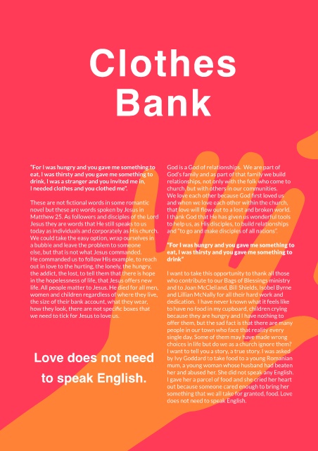 I needed clothes and you clothed me”. church, but with others in our communities.