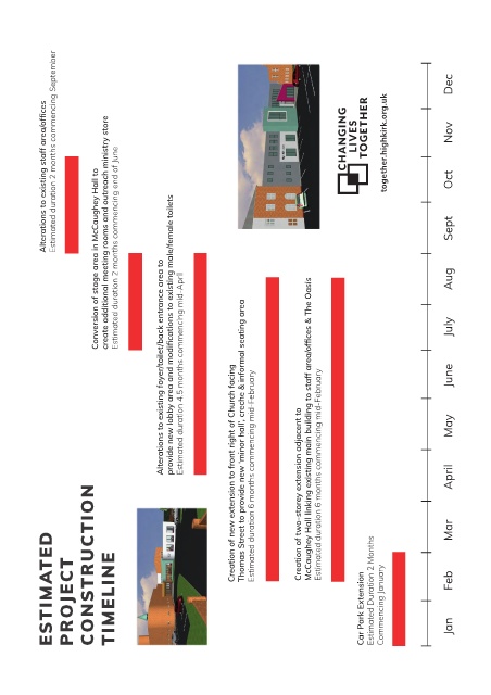 ESTIMATED CT PROJE CONSTRUCTION TIMELINE Alterations to existing foyer/toilet/back entrance area to Estimated duration 4.5 months commencing mid-April Creation of new extension to front right of Church facing Thomas Street to provide new ‘minor hall’, creche & informal seating area Estimated duration 6 months commencing mid-February Creation of two-storey extension adjacent to McCaughey Hall linking existing main building to staff area/offices &