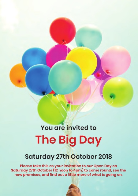 You are invited to The Big Day Saturday 27th October 2018 Please take this as your invitation to our Open Day on Saturday 27th October (12 noon to 4pm) to come round, see the new premises, and find out a little more of what is going on.
