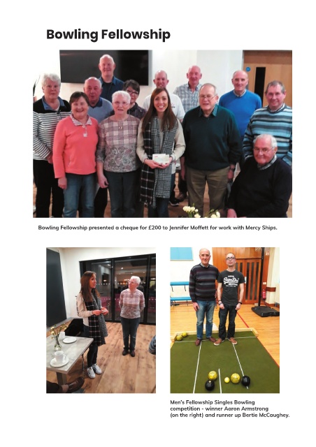 Bowling Fellowship Bowling Fellowship presented a cheque for £200 to Jennifer Moffett for work with Mercy Ships. Men’s Fellowship Singles Bowling competition - winner Aaron Armstrong (on the right) and runner up Bertie McCaughey.