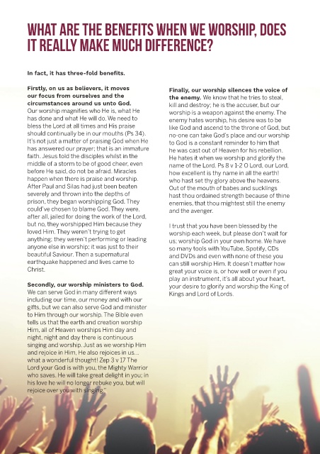 Our worship magni es who He is, what He worship is a weapon against the enemy. The